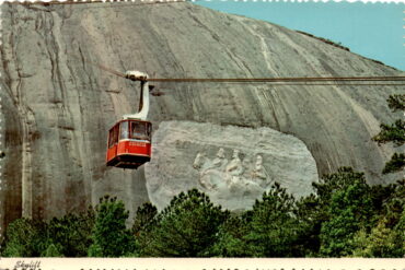 This postcard advertises the Skylift at Stone Mountain Memorial Park in Georgia, specifically for the Stone Mountain Scenic Railroad. The Skylift offers a thrilling experience…
