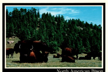 The postcard features a photograph of a herd of North American Bison in South Dakota. The bison, also known as buffalo, were once plentiful in…