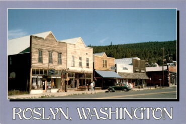 The postcard features a photo of Village Pizza in Roslyn, Washington, a small town known for its downtown business district. Roslyn gained fame as the…