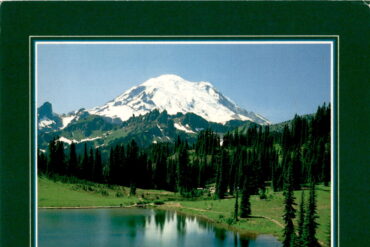 The postcard is a travel card from Mt. Rainier National Park, featuring a photograph of Mt. Rainier and Tipsoo Lake taken by photographer Steve Terrill….