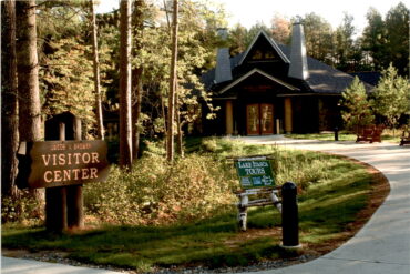 The postcard advertises the Jacob V. Brower Visitor Center at Lake Itasca, which offers tours and educational displays about the history of Itasca State Park….