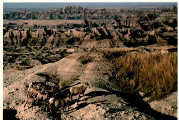 The postcard features a photograph of Rocky Mountain Bighorn Sheep in Badlands National Park, South Dakota. Badlands National Park is known for its rugged terrain,…