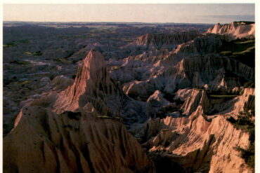 The front of the postcard features a stunning image of the Badlands in South Dakota, known for its unique rock formations and rugged beauty. The…