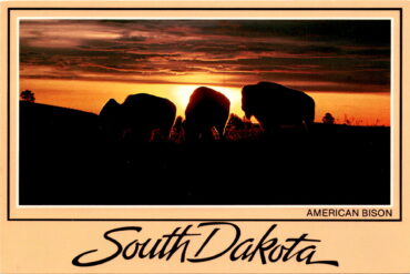 The postcard features an image of the American Bison, which were once on the brink of extinction but are now plentiful in South Dakota. The…