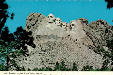 The postcard features an image of Mount Rushmore, a famous monument located in the Black Hills of South Dakota. Mount Rushmore is a colossal rock…