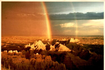 The postcard features the Badlands National Park in South Dakota, known for its unique and striking landscape of colorful spires and peaks. The park attracts…