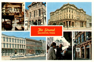 The postcard features an image of The Strand in Galveston, Texas, showcasing the historic district’s restored and vibrant atmosphere. The Strand District is known for…