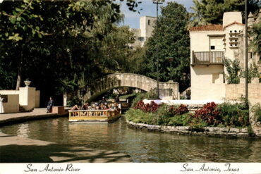 The postcard features a photo of the San Antonio River in San Antonio, Texas, known as the Venice of Texas for its picturesque scenery. The…