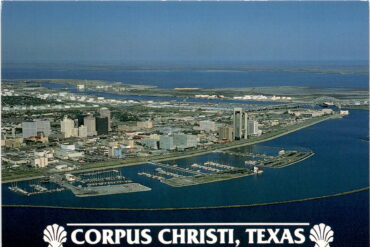 The postcard features a photo of the bayfront in Corpus Christi, Texas, showcasing the unique features of the two T heads and one L head….