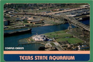 The postcard features an image of the Texas State Aquarium in Corpus Christi, Texas, which is a renowned tourist destination along the Gulf Coast. The…