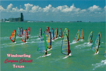 The postcard features a photograph of windsurfing at Cole Park in Corpus Christi, Texas. The location is described as a popular spot for windsurfers due…