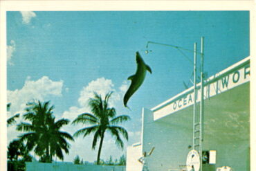 The postcard features a leaping porpoise at Ocean World in Fort Lauderdale, Florida. Ocean World was a popular marine park and oceanarium that operated in…