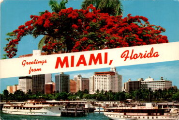 The postcard features a color photo of Florida’s Scarlet Poinciana and Miami’s Magic Skyline. The front of the postcard is a greeting from Miami, Florida,…