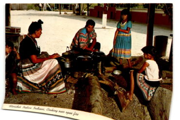 This postcard features a photograph of Florida’s Native Indians, specifically the Miccosukee and Seminole tribes, cooking over an open fire in the Florida Everglades. The…