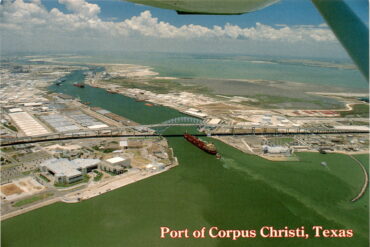 The postcard features an image of the Port of Corpus Christi in Texas, showcasing an oil tanker entering the port under the Corpus Christi Harbor…