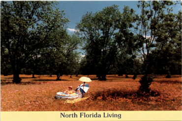The postcard advertises the pleasant living in North Florida, highlighting its rolling hills, oak covered country roads, and the historic Suwannee River as defining features…