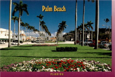 This postcard features an image of Palm Beach in Florida, known for its beautiful Royal Palms and flowers lining the avenue. The photograph was taken…