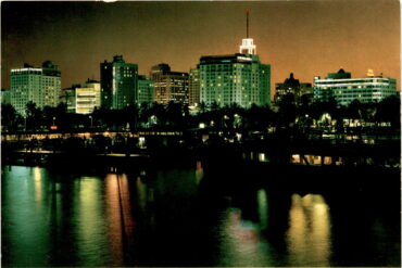 The postcard features a nighttime view of the Miami skyline in Florida, showcasing the vibrant and colorful lights of The Magic City. Miami’s history dates…