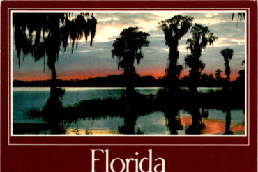 This postcard showcases the stunning beauty of a tropical Florida sunset, capturing the vibrant colors and serene atmosphere of the Sunshine State. The image features…