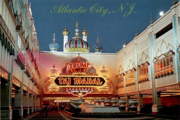The postcard features a night view of the entrance and Grand Concourse of the Trump Taj Mahal Casino Resort in Atlantic City, New Jersey. The…