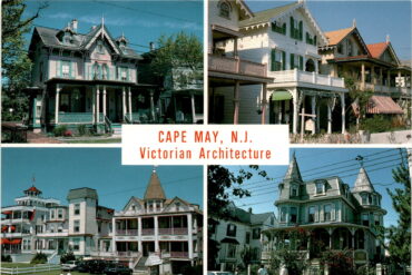 This postcard features various Victorian architecture buildings in Cape May, New Jersey. The upper left corner shows the Linda Lee Bed and Breakfast located at…