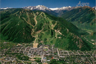 The postcard features an aerial view of Aspen, Colorado, showcasing the majestic Mt. Hayden with an elevation of 13,500 feet and the Elk Mountain Range…