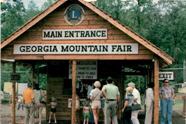 The postcard advertises the Georgia Mountain Fair in Hiawassee, Georgia, organized by the Towns County Lions Club. The fair features traditional and non-commercial attractions such…