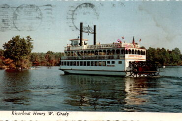 The postcard features a picture of the riverboat Henry W. Grady at Stone Mountain Park in Georgia. The riverboat is part of a fleet of…