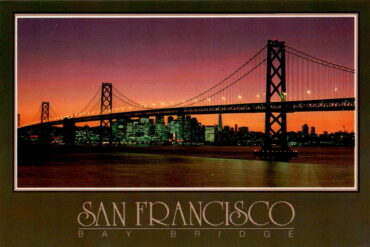 The postcard features a photograph of the San Francisco-Oakland Bay Bridge taken by Ken Glaser Jr. in 1987. The bridge is a prominent landmark connecting…