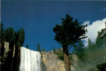 The postcard features a photo of Vernal Falls in Yosemite National Park, known for its vast wildlands carved by water and glaciers. The park is…