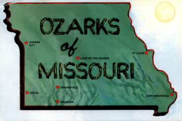 The postcard highlights various locations in Missouri, including Kansas City, the Ozarks, Lake of the Ozarks, Joplin, Springfield, Branson, St. Louis, and Cape Girardeau. Missouri…