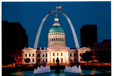 The postcard features the Jefferson National Expansion Memorial in Saint Louis, which includes the iconic Gateway Arch and the Old Courthouse as its main features….