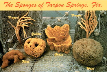 This postcard is promoting the sponges of Tarpon Springs, Florida, known for their high quality and variety. Tarpon Springs has a long history of sponge…