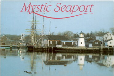 The postcard is a thank-you note referencing a visit to Mystic Seaport, located in Mystic, Connecticut. Mystic Seaport is a maritime museum that recreates an…