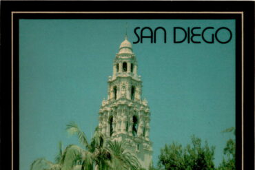 The postcard features an image of the California Bell Tower located in Balboa Park in San Diego, California. Balboa Park is a popular cultural park…