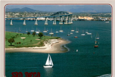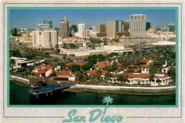 This postcard features an aerial view of San Diego’s Sea Port Village, taken by photographer James Blank. The image showcases the picturesque waterfront area of…