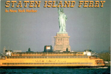 The postcard features an image of the Staten Island Ferry in New York Harbor, with the Statue of Liberty in the background. The Staten Island…