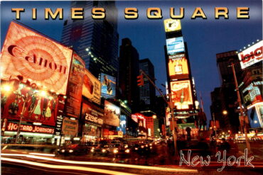 The front and back of the postcard feature various names, places, and events related to New York City and Times Square. Some highlights include:1. Times…