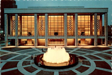 The postcard depicts the Lincoln Center for the Performing Arts in New York City, specifically showing the New York State Theater and the Lincoln Center…